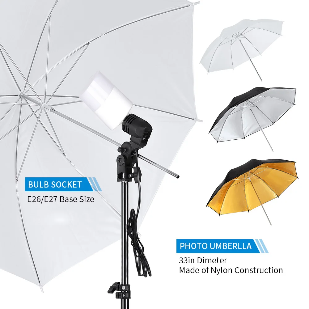 【Large Softboxes & Photography Umbrellas】50 * 70cm/ 20 * 28in softboxes adopts high-quality PET material, with silver inner reflective surface and white softcloth, which can provide the ultimate soft light beam and remove shadows to help you take more professional photos. 5pcs 85cm/33in large photography umbrellas with white/ gold/ silver inner surface work well to diffuse the light from any flash light or constant light.